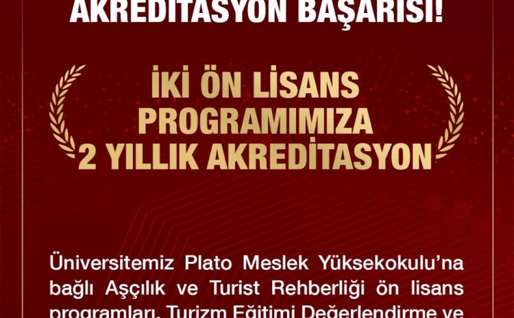 Plato Meslek Yüksekokulumuz bünyesinde yer alan Aşçılık ile Turist Rehberliği ön lisans programlarımız, Turizm Eğitimi Değerlendirme ve Akreditasyon Kurulu tarafından 2 yıl süreyle akredite edilmiştir.